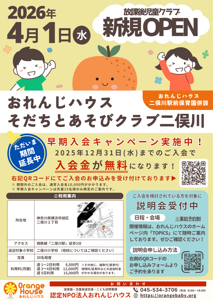 オトクなこの機会に、ぜひ「おれんじハウス そだちとあそびクラブ二俣川」のご利用をご検討ください。