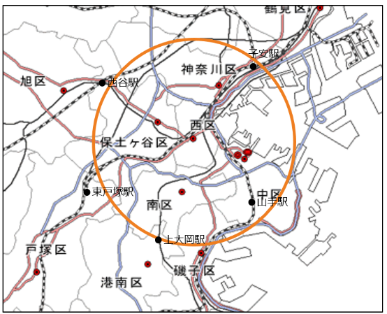 5km地点:子安駅付近、西谷駅付近、上大岡駅付近、保土ヶ谷駅~東戸塚駅間、山手駅付近